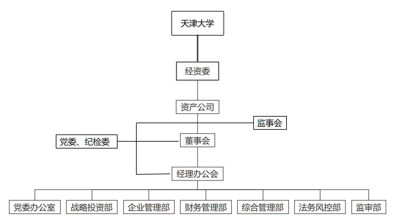 天津大學對資產公司履行股東(投資人)職責,承擔股東(投資人)義務。資產公司堅持黨對國有企業的領導,經學校黨委批準,成立中國共產黨天津大學資產經營有限公司委員會和紀律檢查委員會。公司黨委發揮領導作用,把方向、管大局、保落實,貫徹落實兩個“一以貫之”,堅持和完善“雙向進入、交叉任職”領導體制,把黨的領導融入公司治理各環節,建立健全現代企業制度。根據《公司法》《天津大學資產經營有限公司章程》,天津大學經營性資產管理委員會代表學校行使公司股東職權,公司董事會、經營班子等按照各自的《議事規則》所規定的權限和程序行使職能。資產公司組織架構如下。