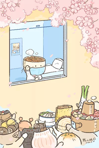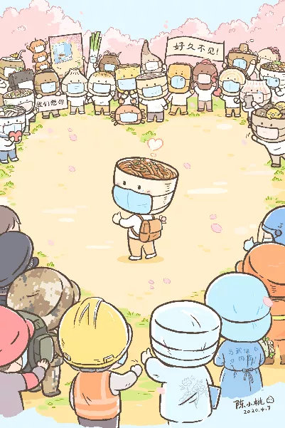 今年春節,舉國上下為抗擊新型冠狀病毒感染的肺炎,都在以最特殊的方式攜手應對。看到身邊的人們或緊張或焦慮,想到奮戰在一線的醫護等工作人員的辛勞,粉絲和朋友們紛紛給陳小桃建議,讓她趕緊出手,畫一些暖心的作品,給大家提提氣。“開始的時候看到有官方媒體發圖,用各種美食照片給武漢熱干面加油,給了我一些靈感,想到是不是可以把這種加油的場面,用漫畫的形式表現出來。”