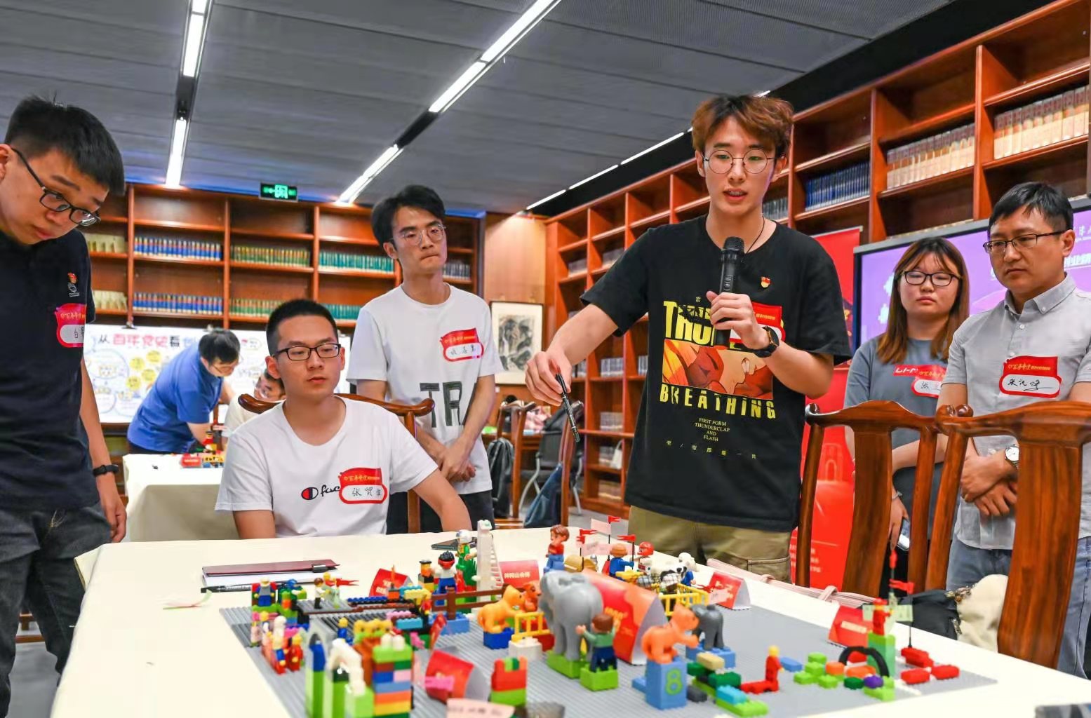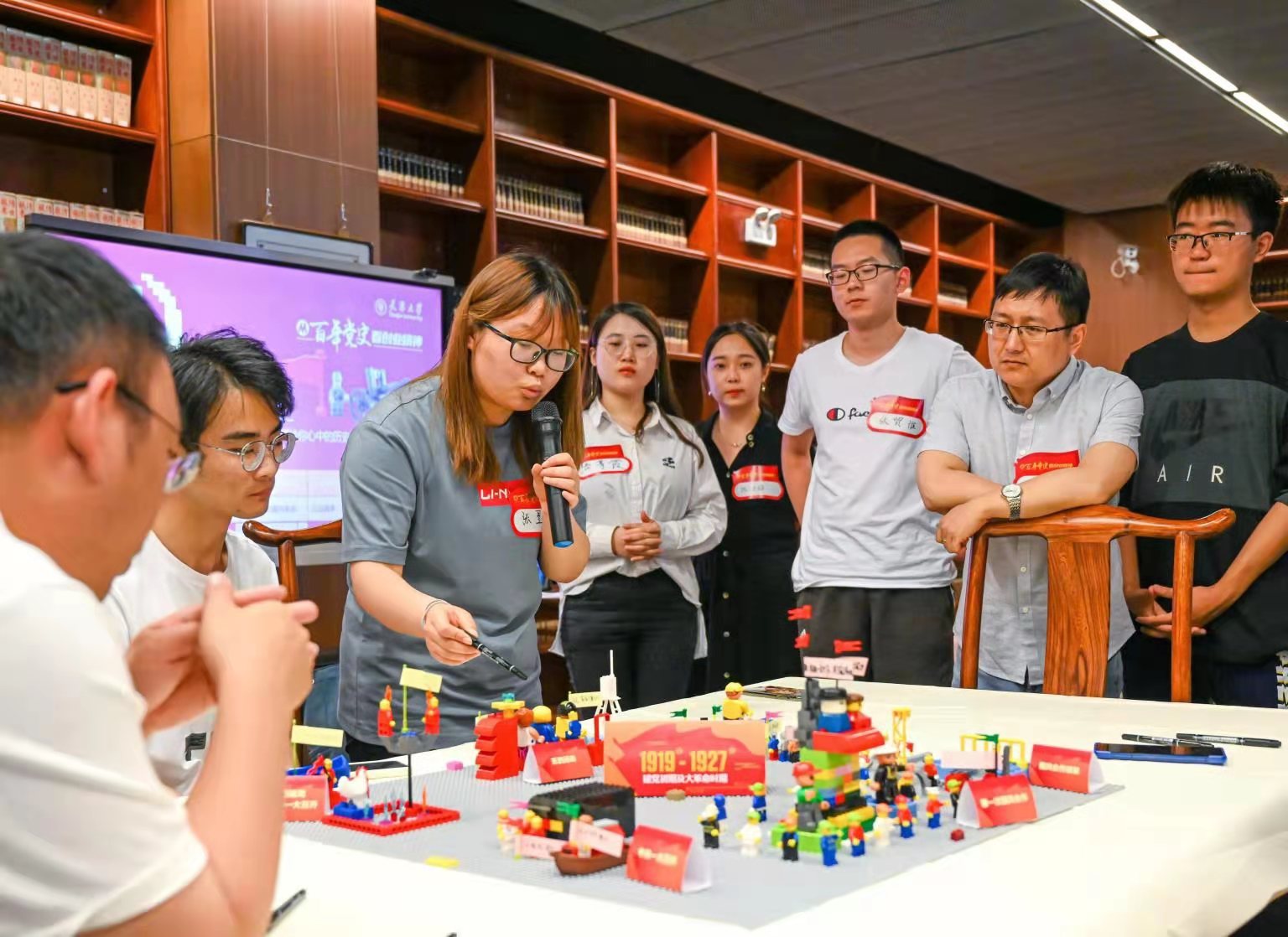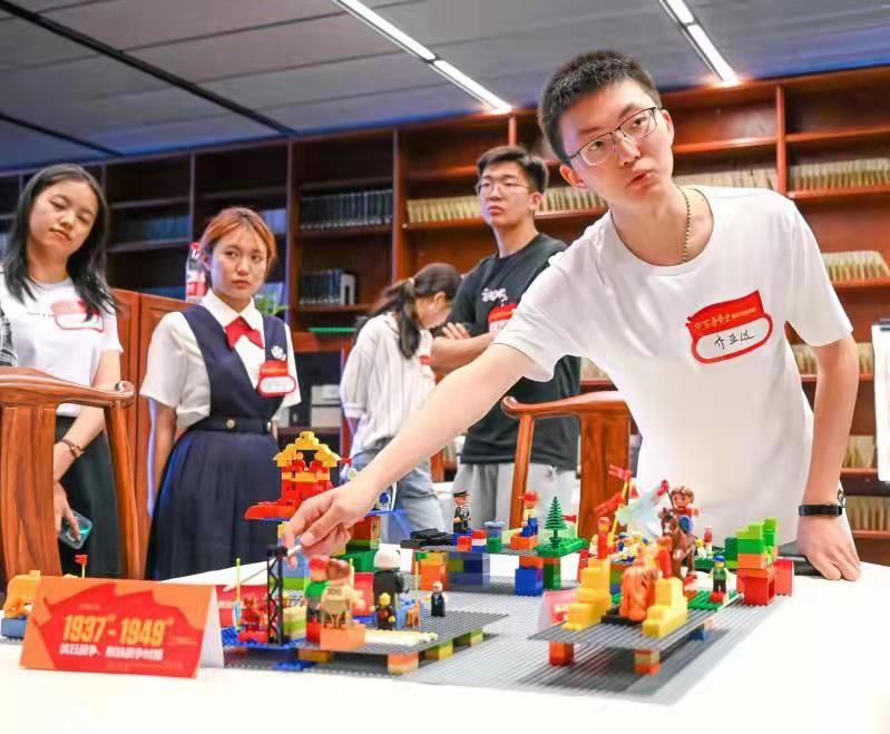 本站訊(記者劉曉艷 圖李天宇)面對一堆樂高零件,你能用它們搭建一座“你心中的黨員精神之塔”嗎?2021年6月19日下午,在天津大學圖書館日新書齋,30名大學生從這個問題開啟了一場奇妙的黨史學習之旅。在接下來將近4個小時的時間中,他們用樂高零件搭建起一個個場景:中共一大、國共第一次合作、南昌起義、長征、開國大典、改革開放、十九大……當所有的場景搭建完成,每位同學都會對自己所搭建的場景講一個生動的黨史故事,而最終所有的場景用紅色的“血脈”線連在一起,便鮮明地形成了共產黨人在百年征程中形成的精神譜系。