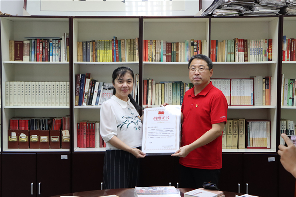 丁曉玲代表老同志們感謝出版社黨總支積極為老同志辦實(shí)事的暖心舉措。今年是中國(guó)共產(chǎn)黨建黨百年華誕,全黨開展黨史學(xué)習(xí)教育。出版社黨總支聚焦老同志的特點(diǎn)和需求,為老同志辦實(shí)事,從今年開始,每年都會(huì)精心挑選適合老同志的書籍,捐贈(zèng)給老同志們,豐富老同志的文化生活。特別感謝出版社黨總支這一關(guān)心關(guān)愛(ài)老同志們的長(zhǎng)效機(jī)制,離退休工作處將充分利用好這些書籍,豐富老同志們的精神文化生活。隨后,丁曉玲代表離退休工作處向出版社黨總支贈(zèng)送了捐贈(zèng)證書。