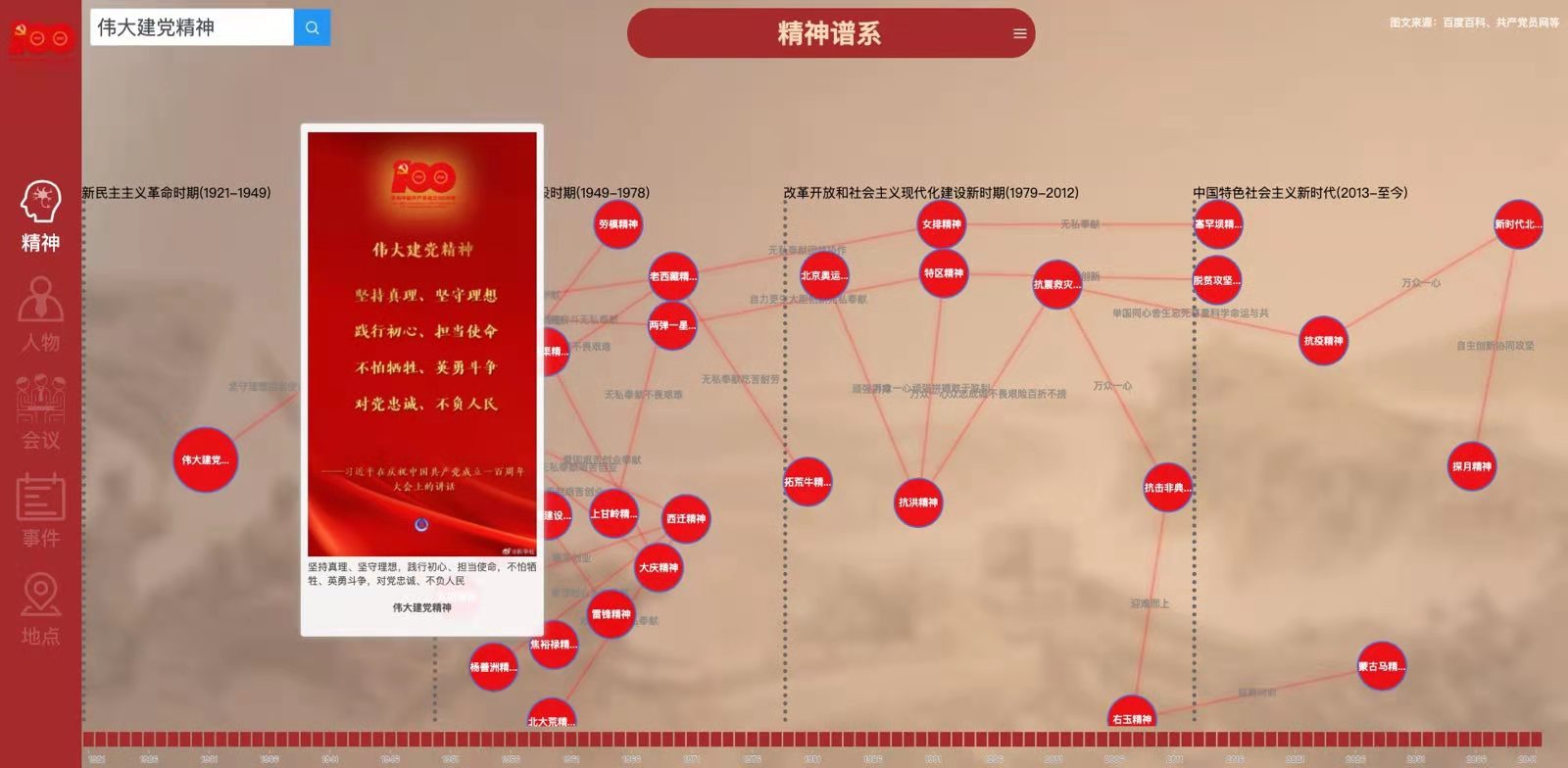 “慶祝中國共產(chǎn)黨成立一百周年大會首次闡述了偉大建黨精神。回顧黨的百年歷程,諸如堅韌不拔、無私奉獻、眾志成城等精神內(nèi)涵,貫穿黨的發(fā)展始終。可視化系統(tǒng)采用深度圖搜索算法,將蘊涵相同內(nèi)涵的精神串聯(lián)起來,清晰地展現(xiàn)了精神傳承脈絡,也讓我們更深刻地理解了‘偉大建黨精神’的內(nèi)涵。”參與系統(tǒng)開發(fā)的智能與計算學部2020級研究生黨支部書記柳鵬凱說,系統(tǒng)的開發(fā)過程也是同學們深入學習黨史感悟黨的精神的過程。