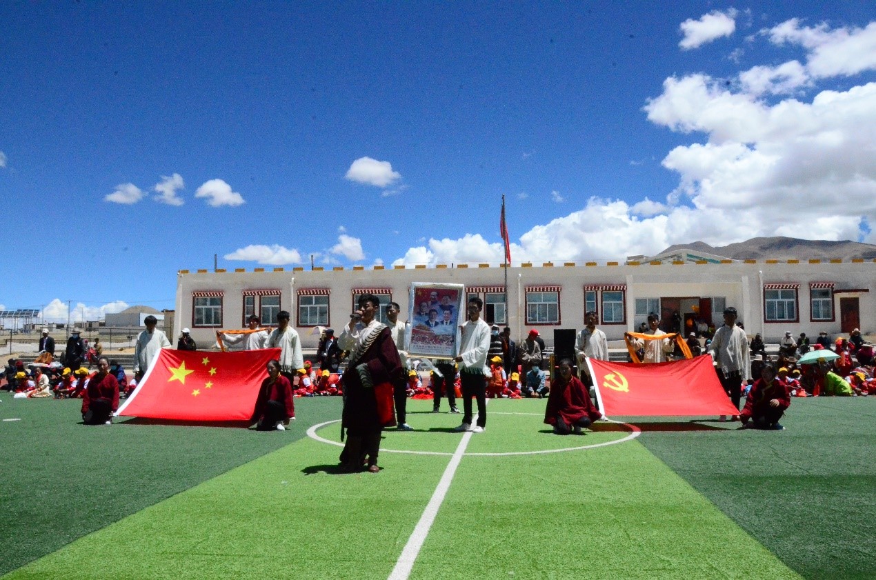 本站訊(通訊員 范心語)2021年6月,天津大學地科院構造地貌中心徐勝課題組來到西藏自治區那曲市尼瑪縣達果鄉,開展國家自然科學基金和國家重點研發計劃項目野外科學考察工作,得到了當地黨委、政府和各族干部群眾的大力支持。6月29日上午,正值中國共產黨百年華誕到來之際,我院師生與達果鄉各族干部群眾齊聚達果鄉小學,載歌載舞,共慶“中國共產黨成立100周年暨西藏和平解放70周年”。