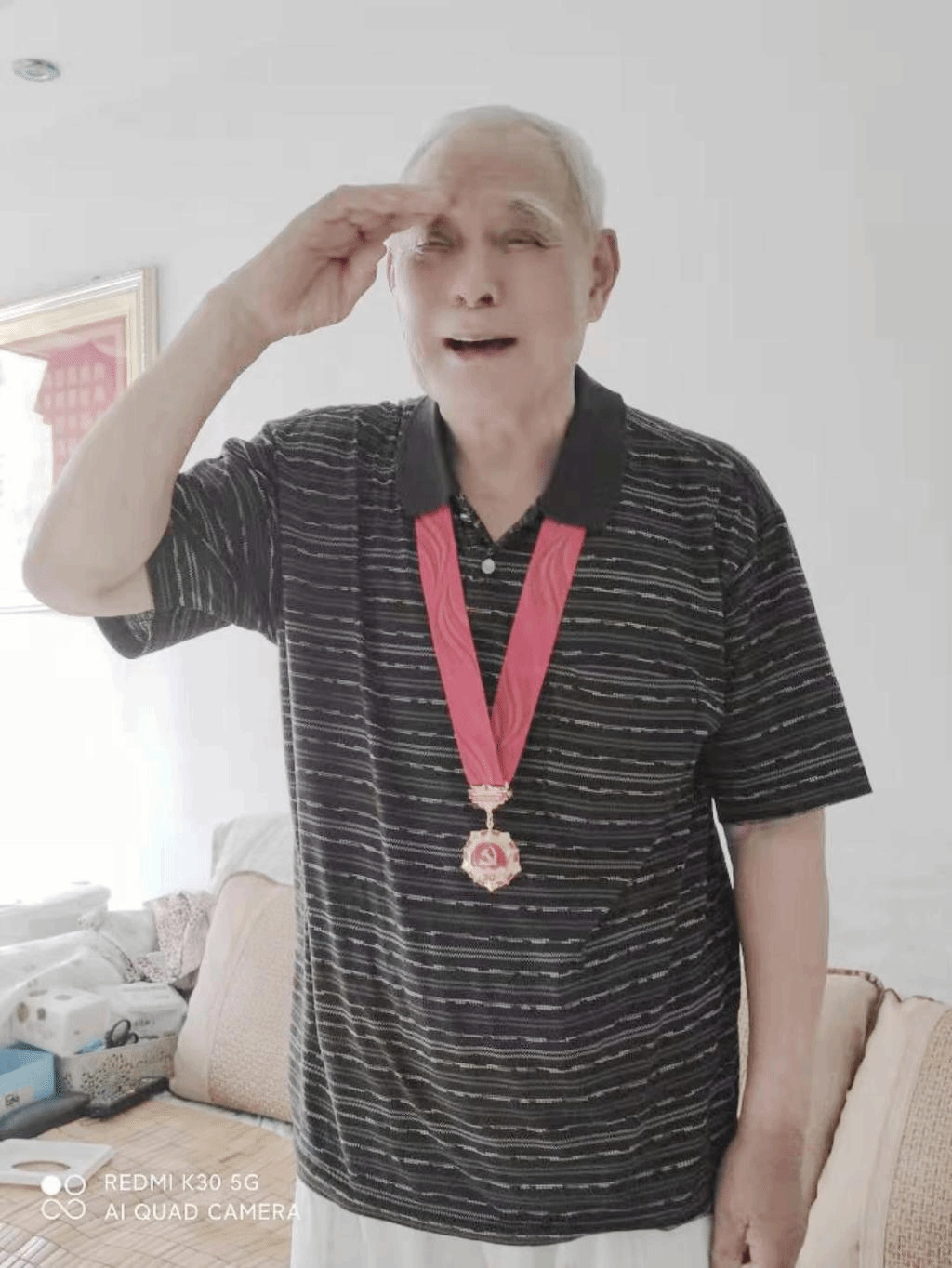 施克濟(jì)老師的女兒,在“七一”這天特別發(fā)來(lái)年近90歲的老父親佩戴“光榮在黨五十年”紀(jì)念章向黨致敬的照片: