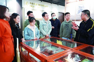 天津大學張太雷研究中心教授蔡文杰(右一)在張太雷展室向學生們講述烈士生平。天津大學供圖