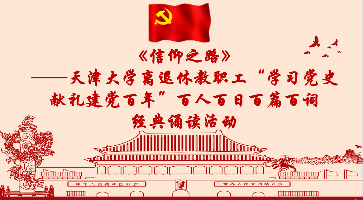 在中國共產(chǎn)黨百年華誕之際,為重溫黨的光輝歷程,牢記黨的初心使命。堅決做到學(xué)史明理、學(xué)史增信、學(xué)史崇德、學(xué)史力行,天津大學(xué)離退休工作處特舉辦《信仰之路》——天津大學(xué)離退休教職工“學(xué)習(xí)黨史 獻禮建黨百年”百人百日百篇百詞經(jīng)典誦讀巡展。活動精選十本紅色書籍,設(shè)置100個主題,邀請離退休老同志、在職教工黨員、青年學(xué)生共計100人,接力誦讀優(yōu)秀篇章與感人段落。從建黨百年倒計時100天開始,采用每天推出一篇朗讀文稿的模式,以“100名朗誦者、100篇經(jīng)典誦讀”的形式隆重慶祝中國共產(chǎn)黨成立100周年。