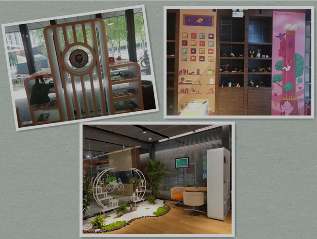 休閑區內放置了百部經典名著供師生閱讀,讓師生被濃厚的文化氛圍所包裹。休閑區內還布置了隨處可見的綠植和花卉、圖書館插畫以及精致的擺設,為師生創造出一個優雅、舒適且別具風格的休閑環境;展示著各式各樣的小物品,如千姿百態的折紙、校園文創產品,師生們可以在此自由參觀;還提供音響設備、自助售賣咖啡等。