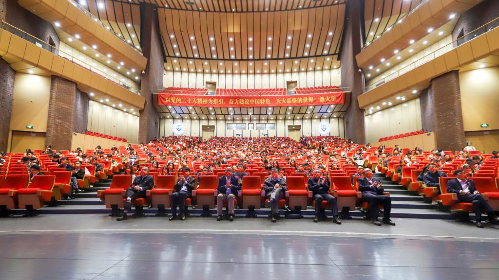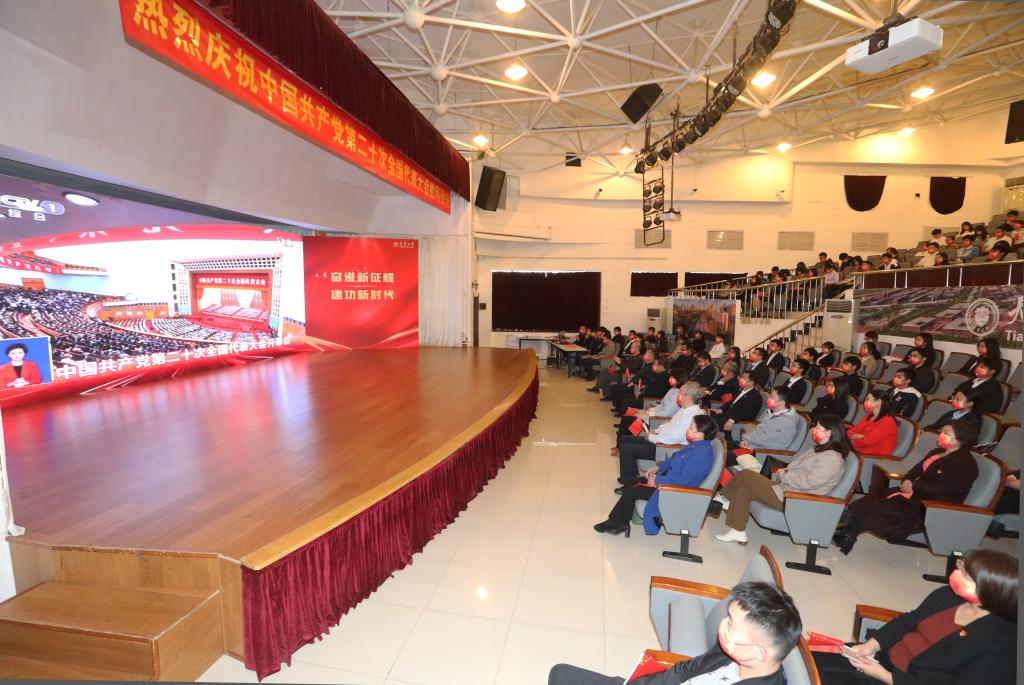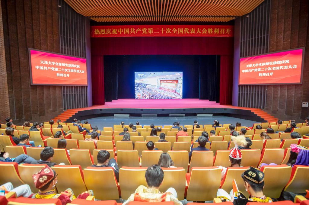 天津大學全校師生干部群眾紛紛通過電視、廣播、網絡等渠道收看收聽黨的二十大開幕會。校領導及全校機關干部和師生代表在北洋園校區(qū)求實會堂、衛(wèi)津路校區(qū)大學生活動中心報告廳集中收看。在集中收看現場,大家佩戴黨徽團徽、手持鮮艷的國旗,聚精會神收看大會盛況,掌聲不斷。