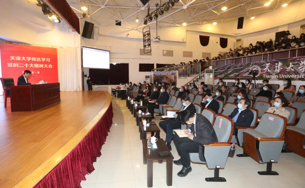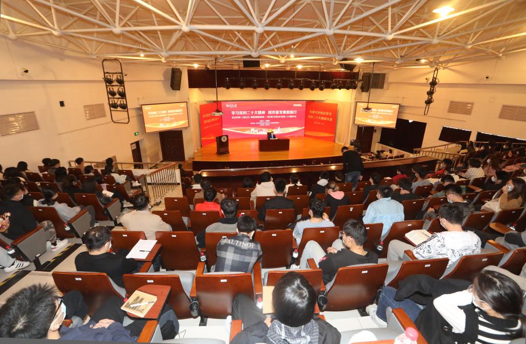 11月8日下午,首場巡講報告會暨天津大學傳達學習黨的二十大精神大會在天津大學衛津路校區舉行,黨的二十大代表、第二十屆中央候補委員、中國工程院院士、天津大學校長金東寒教授作首場報告。市委常委、市委教育工委書記王旭,天津大學校領導及兩百余名師生代表參加報告會,會議由市委教育工委專職副書記孫志良主持。