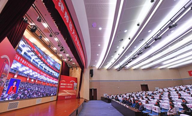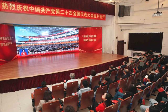 10月16日上午,天津工業大學師生在學校藝緣大禮堂集中收看中國共產黨第二十次全國代表大會開幕盛況。張立 劉孜勤 攝