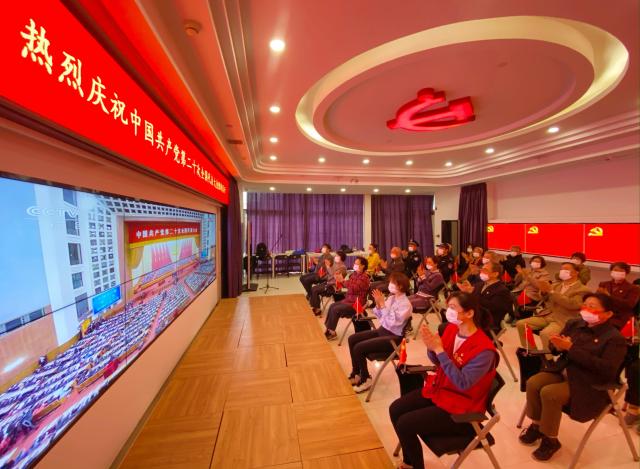 在東麗區金橋街道怡盛里社區,居民早早來到黨群服務中心,收看黨的二十大開幕式盛況,現場不時響起熱烈掌聲。 劉乃文 翟鑫彬 攝