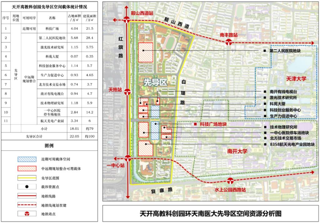 核心區內劃定“鞍山西道—白堤路—復康路—紅旗路”合圍區域為先導區,占地面積約1.1平方公里。以天津科技廣場為核心、科研西路為中軸向兩側延伸的11個空間載體為主要供給,可提供總占地面積22.05萬平方米、總建筑面積100余萬平方米的載體空間。