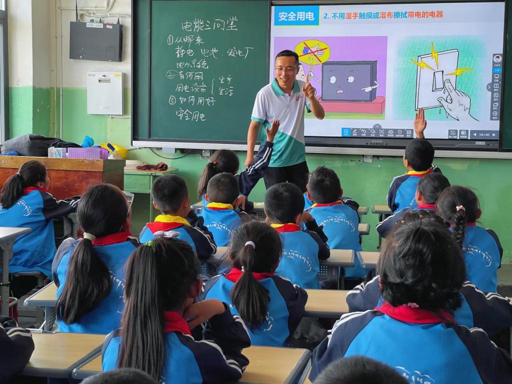 在日喀則市桑珠孜區第一小學,陳曉龍教授為同學們講授課程《電能三問》。他以藏區孩子能切身感受到的靜電和閃電現象作為導入,再層層遞進地講解電池、發電廠、電力系統相關知識,讓孩子們清晰地了解到走進千家萬戶的電能到底從哪里來。陳曉龍還利用豐富形象的用電場景圖,從安全用電的角度,強化孩子們的安全用電意識。