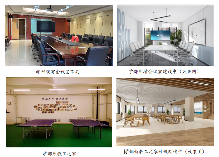 針對學部會議室數量不足的問題,學部擴建會議室面積200余平米,新規劃會議室6間,對全部會議室進行會議系統智能化改造,以提高會議室使用效率。同時,學部對教工之家進行升級改造,增加更多實用功能,整體空間進行布局優化,規劃設計討論區,增加小規模報告廳、來訪接待區等功能,極大提高空間利用率,為教工交流等提供更好的空間平臺。
