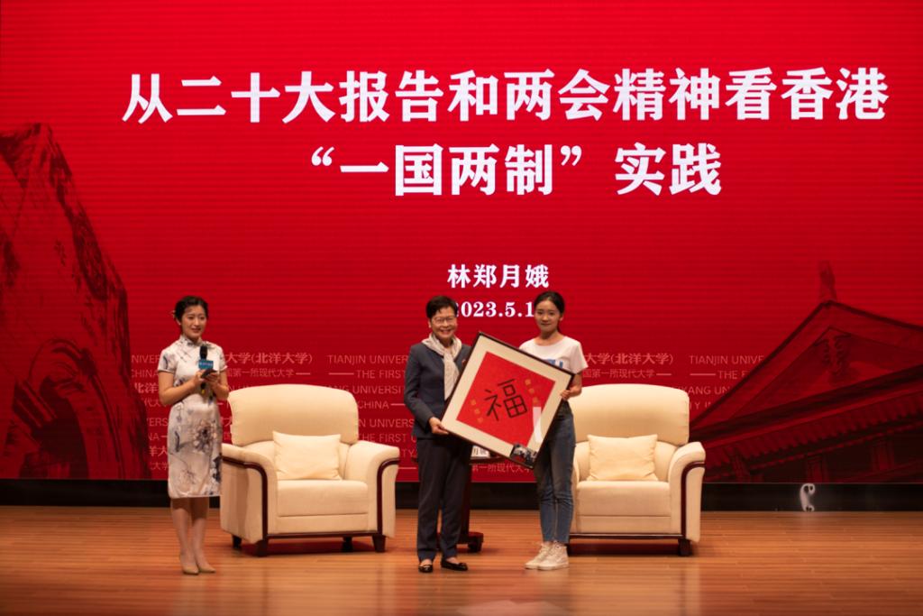 在北洋園校區,林鄭月娥做客北洋大講堂,在國家大型地震工程模擬研究設施仿真中心報告廳,作以《從二十大報告和兩會精神看香港“一國兩制”實踐》為主題的演講并與天大師生共同交流。