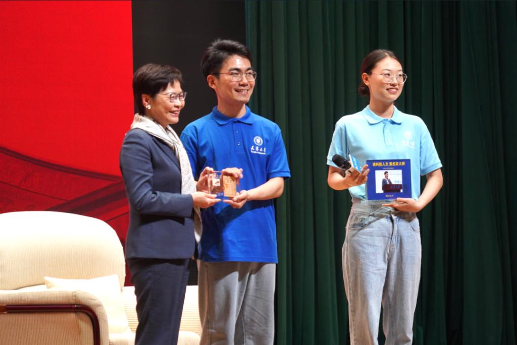 林鄭月娥女士從香港百年歷史著手,回顧了香港的發展歷程。她著重與同學們分享了香港自1997年7月1日回歸祖國母親懷抱以來所取得的豐碩建設成果和自己擔任香港特別行政區行政長官的感受。她表示,香港在國家安全和選舉制度的雙重保障下,堅持“一國兩制”正確軌道,她比任何時候都對香港更有信心、更肯定香港可以融入國家發展大局,在國家邁向第二個百年奮斗目標的進程中,發揮不可替代的作用。以“一國”為本、“一國”為根,以“愛國者治港”為原則,“兩制”定會枝繁葉茂,香港這顆祖國的掌上明珠,必定可以煥發越來越迷人的光彩。