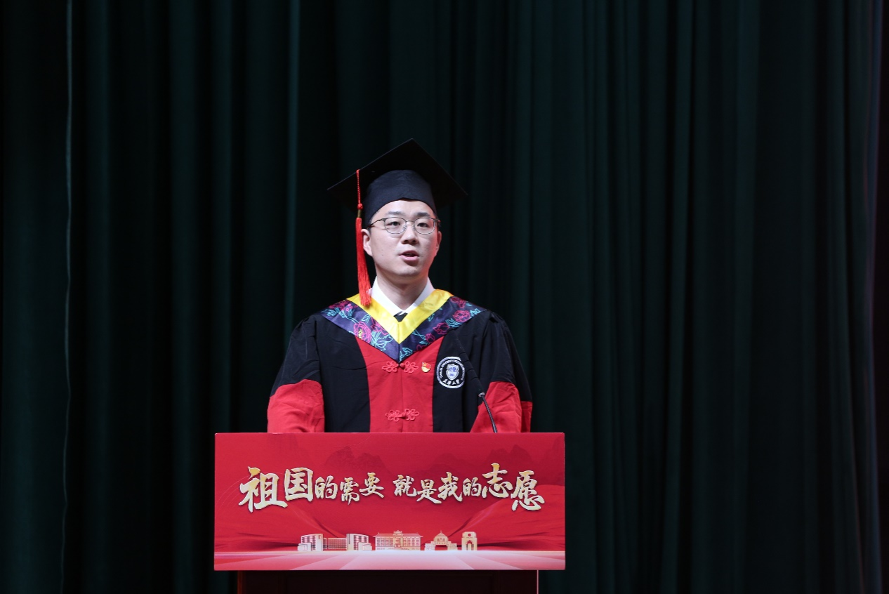 畢業生黨員代表、材料學院2024屆博士生巴凌志講述了自己求學時被學校氛圍熏陶、導師言傳身教的故事,立志將七年間在天大習得的知識和本領融入到“兩彈一星”精神中去,做民族脊梁,為國之重器的研制生產貢獻屬于自己的一份“天大”力量。